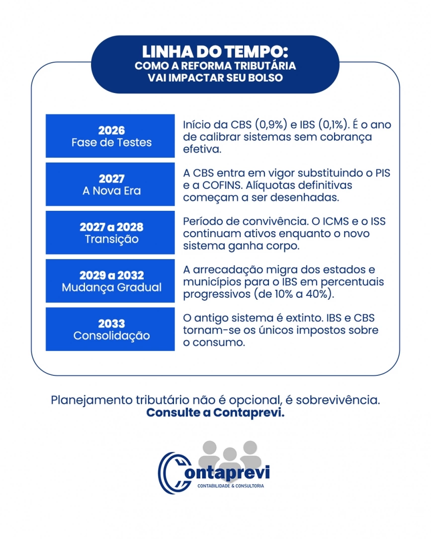 A Reforma Tributária não acontece de uma vez. Ela segue um cronograma gradual que começa com testes técnicos e evolui para a substituição definitiva dos impostos até 2033.