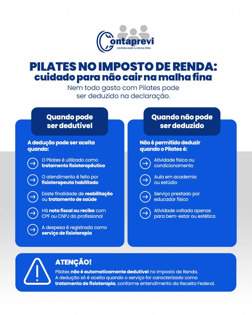 Quando o Pilates é praticado apenas como atividade física, condicionamento ou bem-estar, a despesa não pode ser utilizada para dedução no Imposto de Renda.
